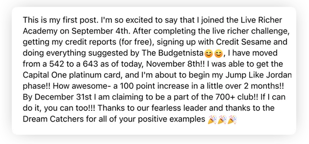 Each lesson focuses on completing one financial task at a time. As a member of the Course, you’ll be invited to a private group where thousands of members are there to hold you accountable, offer resources and provide encouragement throughout the Courses and beyond.