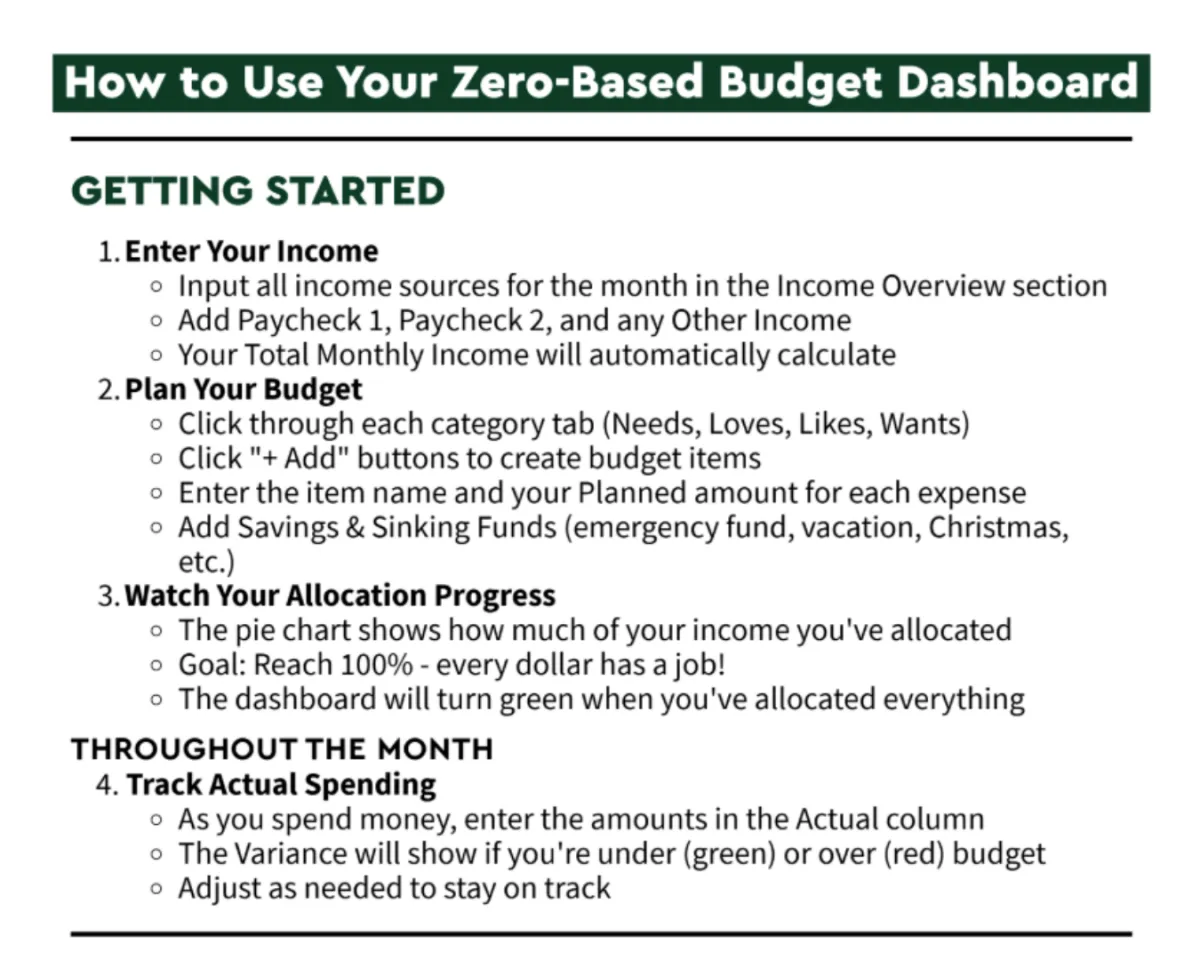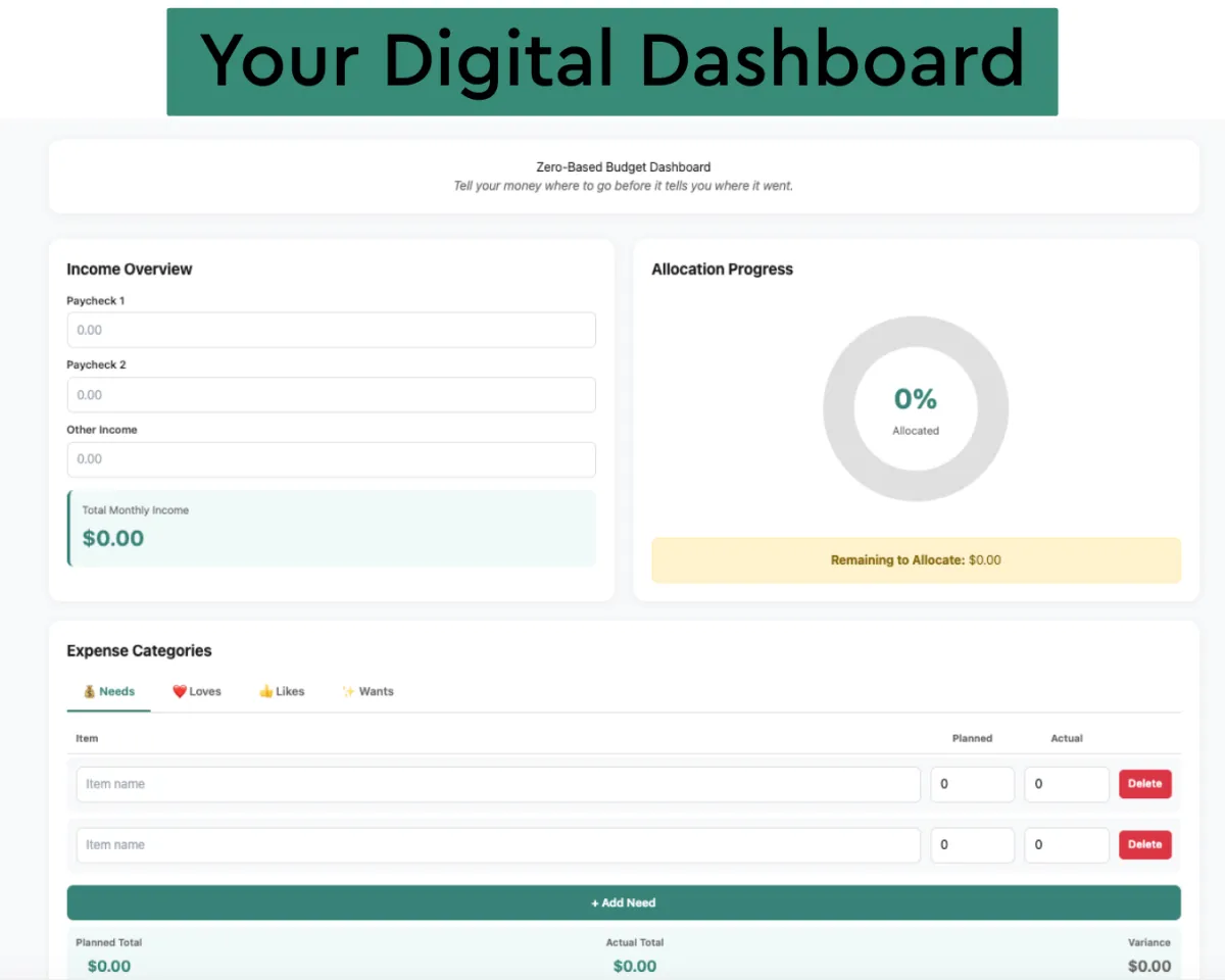 Budgeting feels different when the numbers finally make sense. This Zero-Based Budget Dashboard helps you assign every dollar a purpose using The Budgetnista’s signature categories: Needs, Loves, Likes, Wants.
